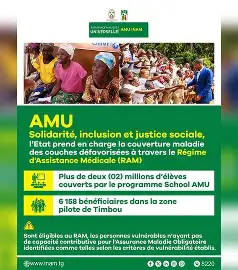 La phase pilote, lancée à Timbou dans la région des Savanes, vise l’enrôlement de 6 158 personnes, marquant une étape décisive vers une couverture santé réellement universelle. Fondé sur les principes d’universalité, solidarité, égalité, tiers-payant et cotisation selon les moyens, le RAM s’inscrit dans une logique de justice sociale et de cohésion nationale.