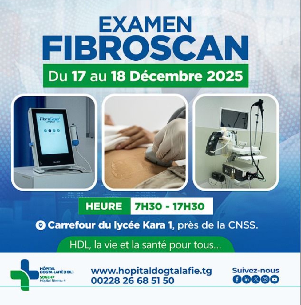 L’hôpital de référence Dogta-lafiè de Kara organise, les 17 et 18 décembre 2025, une opération exceptionnelle de dépistage hépatique au Carrefour du lycée Kara 1, près de la CNSS. De 7h30 à 17h30, la population pourra bénéficier, à prix réduit, du Fibroscan, une technologie médicale de pointe habituellement très onéreuse