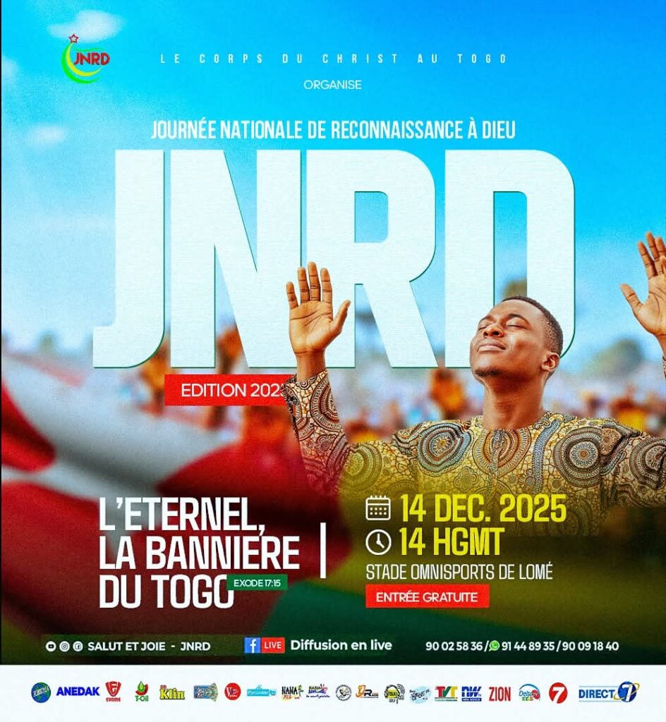 Le Corps de Christ au Togo, en partenariat avec le Groupe Salut et Joie et plusieurs organisations chrétiennes, organise la 13ᵉ Journée Nationale de Reconnaissance à Dieu (JNRD), un rendez-vous spirituel devenu incontournable dans le paysage religieux et social du pays, ce dimanche 14 décembre au Stade Omnisports de Lomé, ainsi que dans plusieurs autres villes du Togo, notamment Atakpamé, Bassar, Blitta, Dapaong, Kara, Kpalimé, Notse, Pagouda, Sokodé, Sotouboua, Tabligbo, Tandjouaré, Tsevié et Vogan.